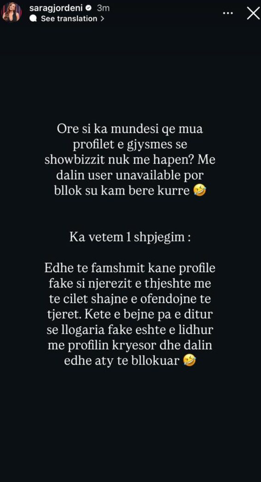 Në disa postime në Instagram, ajo shprehet e habitur pse shumë profile të showbiz-it nuk i hapen më, duke i dalë “user unavailable”, megjithëse sipas saj, ajo nuk i ka bllokuar kurrë.