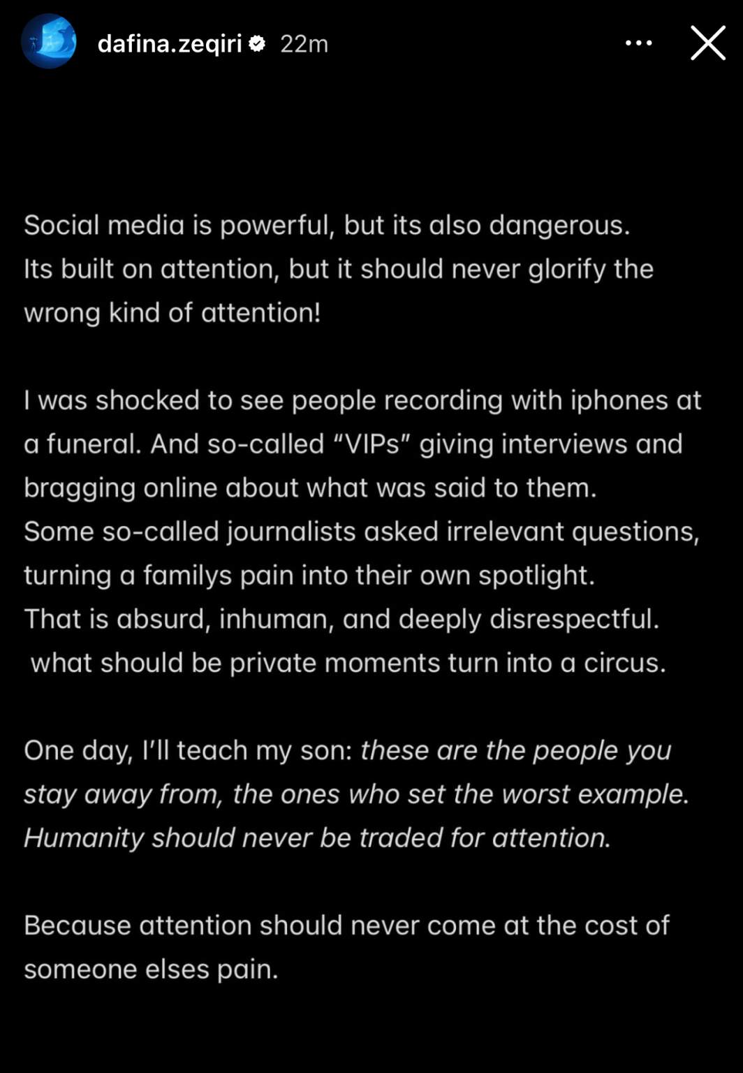 Më pas, Dafina shpërtheu edhe ndaj “VIP”-ave, ku tha: “U trondita kur pashë njerëz që filmonin me telefona në një varrim. Ndërkohë disa të ashtuquajtur “VIP” jepnin intervista e mburreshin online me fjalët që u ishin thënë. Madje edhe disa gazetarë bënin pyetje të parëndësishme, duke e kthyer dhimbjen e një familjeje në dritën e reflektorit për interesin e tyre. Kjo është absurde, çnjerëzore dhe thellësisht mosrespektuese. Çfarë duhet të ishin momente private, u shndërruan në një shfaqje”.