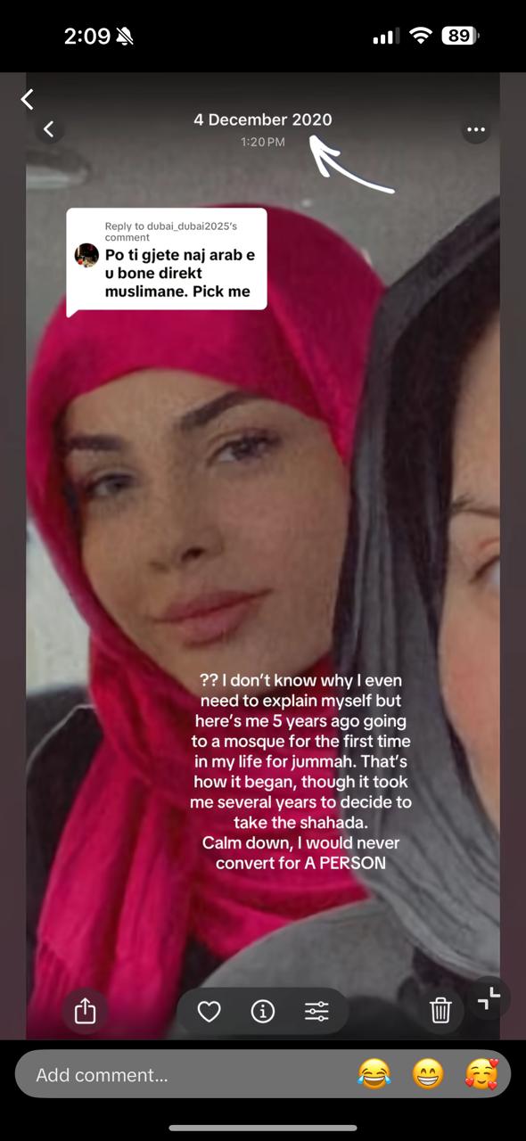 “Qetësohuni, kurrë nuk do konvertohesha për dikë”, është shprehur Aleksia, duke shtuar se udhëtimi i saj shpirtëror ka nisur pesë vite më parë, kur për herë të parë kishte marrë pjesë në faljen e xhumasë.