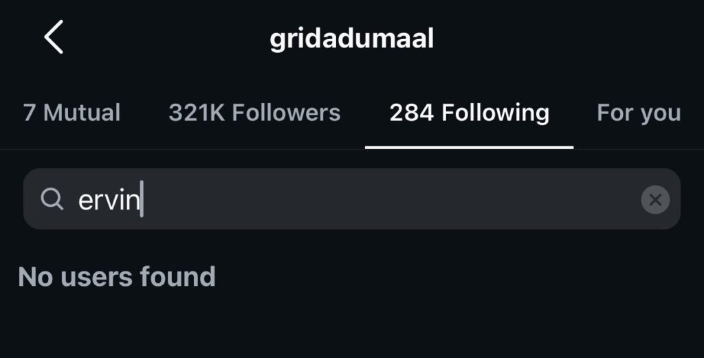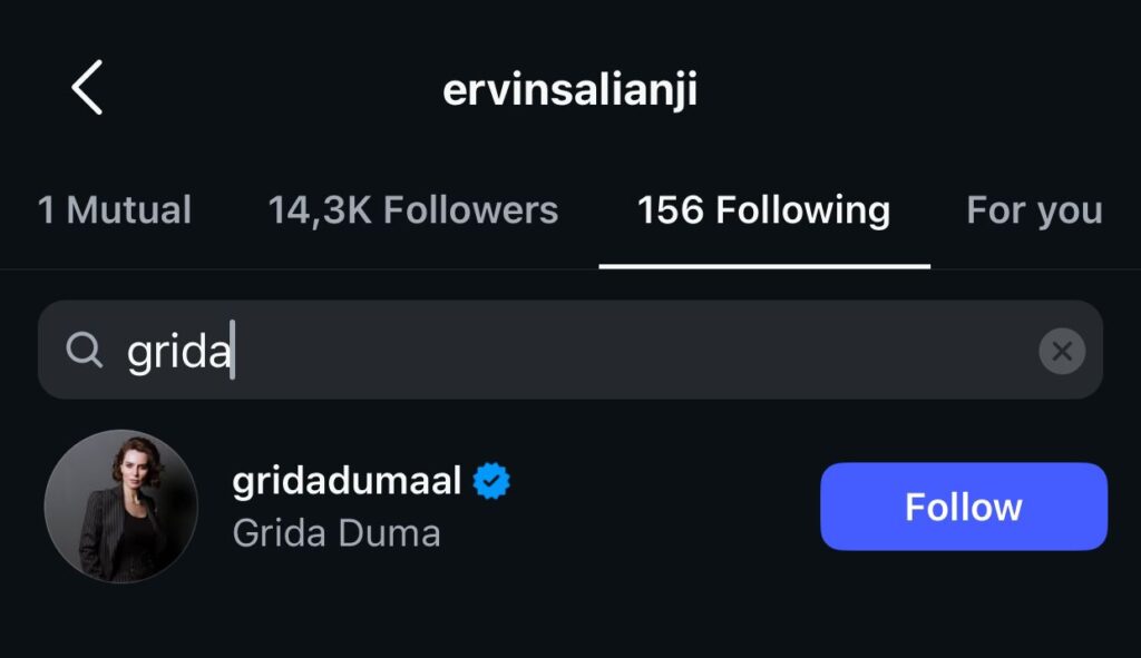 Nuk e dimë nëse po ndodh një rastësi incidentesh në showbiz (si ajo e Elhaidës me Ledianin), por edhe Grida Duma nuk e ka më Ervin Salianjin në listën e personave që ndjek në Instagram! Ky i fundit nga ana tjetër, e ndjek ende Gridën.